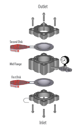 Double disk assemblies consist of three safety head components; an inlet, a mid-flange and an outlet with a disk installed between the inlet and mid-flange. A second disk is installed between the mid-flange and outlet flange. All Sta-Saf safety heads models are available as double disk assemblies.